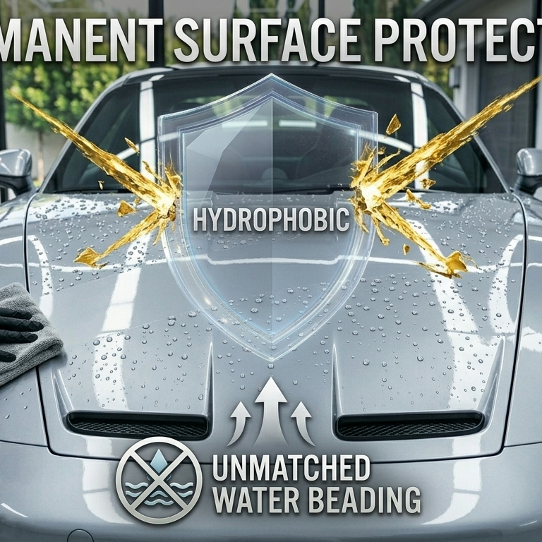 Beyond wax. Beyond sealant. Experience a permanent, high-gloss shield that repels water, dirt, and environmental contaminants for years, not weeks.